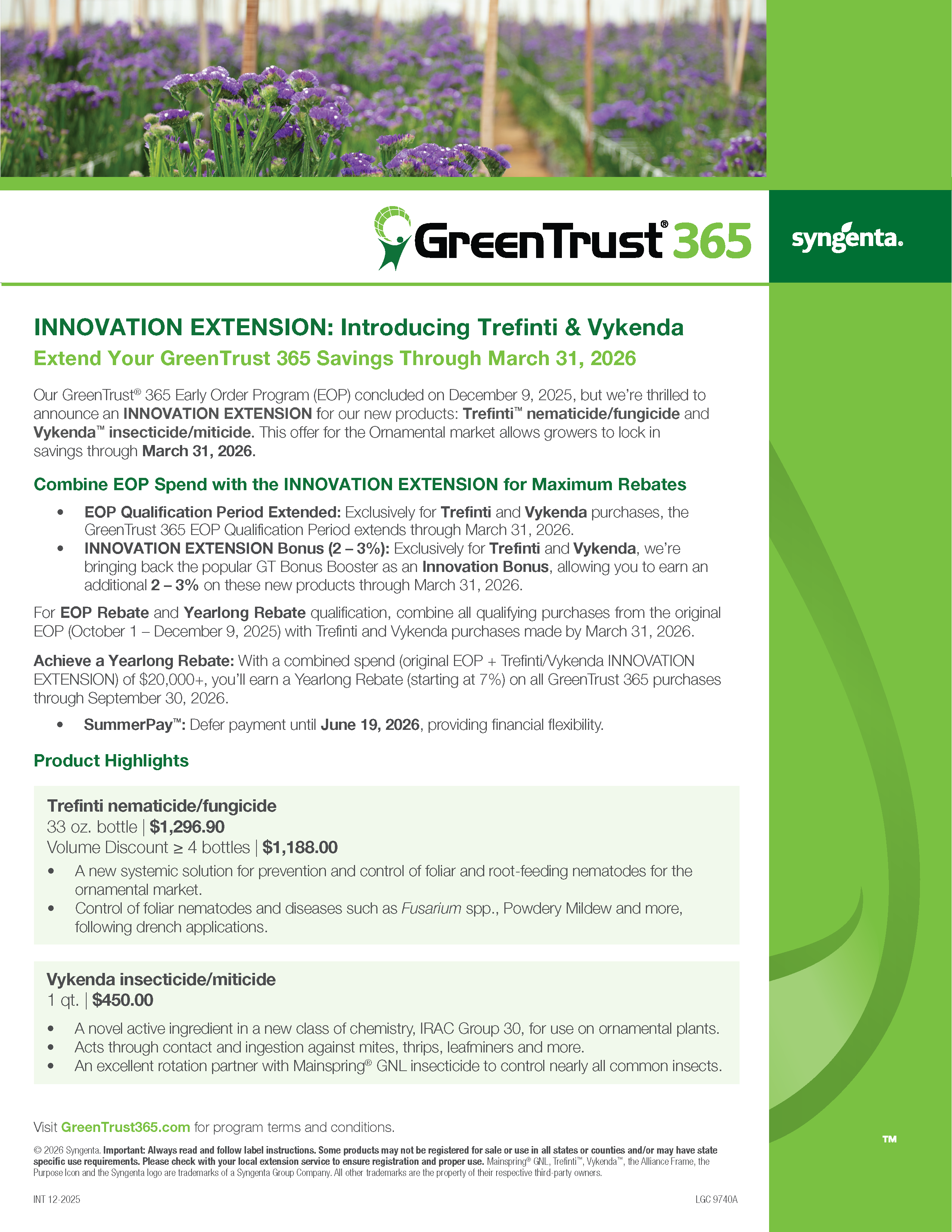 MainspringĀ® GNL insecticide for plants, guards greenhouse and nursery crops from key chewing and sucking pests, including thrips, whiteflies, aphids, caterpillars, leafminers, leaf-feeding beetles, soft scales and lacebugs. It offers reliable, extended protection as part of a preventive pest management strategy.