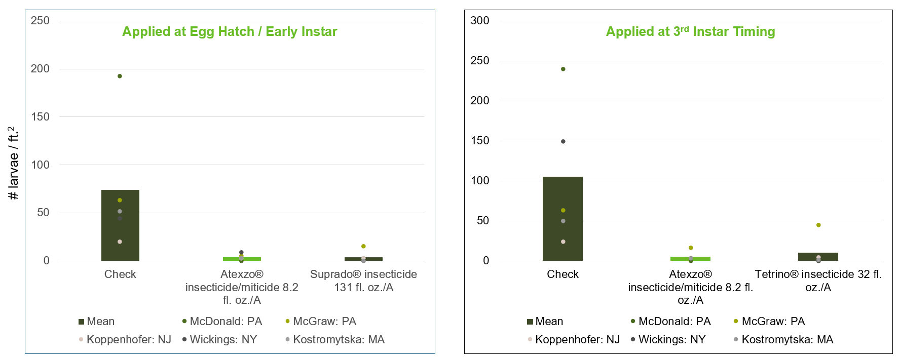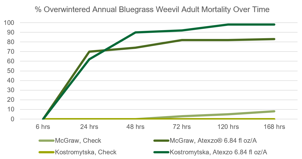 Source: Pennsylvania State University and University of Massachusetts, 2022. Lab bioassay. Applied as a directed adult spray on overwintering populations of ABW adults collected from the field. Treatments applied at 44 GPA.Annual Bluegrass Weevil Larvae Control